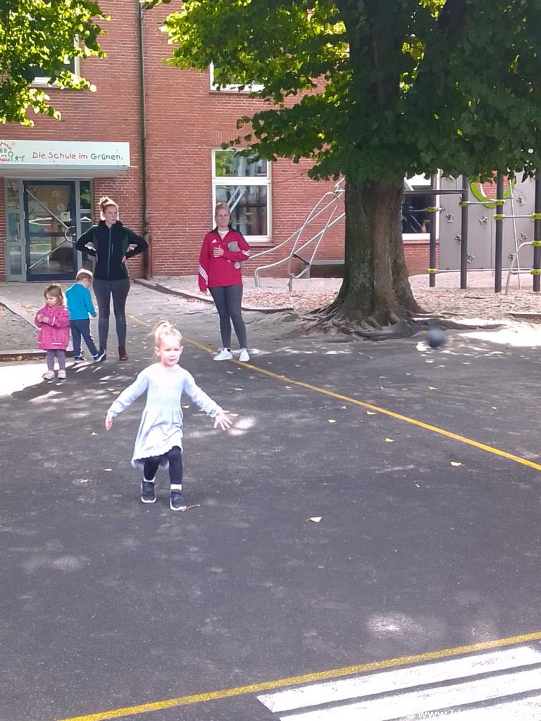 Tanja & Timo Loy betreuen die Nachwuchsliga. Aller Anfang ist schwer und dann geht die Sicherheit einfach vor. Genau deshalb geht die Nachwuchsliga auf das Schulgelände der GS Middels. Dort ist alles vorhanden, was ein professioneller Boßler*in von morgen benötigt. Trainingsgerät, Trainingsplatz, Sportgeräte, die Boßelkugeln und eine nachempfundene Straßenzeichnung auf dem asphaltierten Platz, die man schon im frühen Alter kennen lernen sollte.